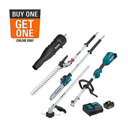 With zero emissions, lower noise, and maximum versatility, the 18-Volt LXT Couple Shaft Power Head Kit with a 13 in. String Trimmer, 10 in. Pole Saw, 20 in. Articulating Hedge Trimmer, and Blower Attachments (XUX02SM1X6) is a welcome solution for a range of trimming, cutting, and clean-up applications. It's powered by one Makita 18-Volt LXT Battery for performance and run time without the hassles of gas and without leaving the 18-Volt LXT battery platform. The Power Head features a lever-style lock system for quick tool-less installation and replacement of attachments. The XUX02SM1X6 kit includes the 13 in. String Trimmer Couple Shaft Attachment (EM409MP) featuring the rapid loading bump and feed trimmer head, the 10 in. Pole Saw Couple Shaft Attachment (EY402MP), which provides a seven foot fixed length for trimming hard to reach branches, the 20 in. Articulating Hedge Trimmer Couple Shaft Attachment (EN402MP) which features 13 angle settings with 135° of working range for efficient trimming of overhead and low-lying hedges, as well as the Blower Couple Shaft Attachment (UB401MP) which features an axial fan design that provides high blowing force power needed for quick clean-ups.