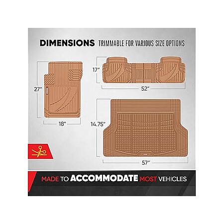 Front 27"L x 18"W / Rear 17"L x 52"W / Cargo Liner: 54"L x 37"W, making them versatile for a variety of vehicle types.