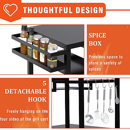 - Easy to Move: Ergonomic design with handles on both sides and four 360° free swivel wheels on the bottom make it easy to move the grill cart to where you need it. Each wheel can be easily locked and parked wherever you need it.