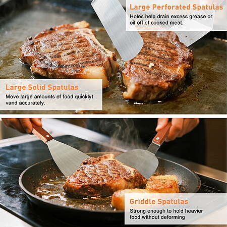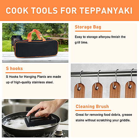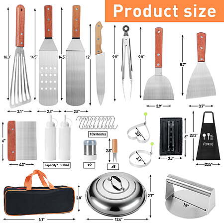 | Product Description: | 37Pcs Flat Top Griddle Tools Set with Long/Short Spatulas Scraper & Basting Cover - Stainless Steel Grill Cooking Kit for Teppanyaki Camping - Complete Griddle Accessories Kit for Men Women RYTHING YOU NEED TO MASTER THE GRIDDLE - The 37Pcs teppanyaki griddle tools set includes long griddle spatulas, burger flipper, slant edge scraper, fish turner, basting cover, grill press, chopper, cleaning pad, utility knife, serving tongs, egg rings, apron, salt shakers, corn holders, squeeze bottles, S hooks and storage bag. EXCLUSIVE COMBINATION&PREMIUM QUALITY GRIDDLE KIT - Made of stronger&thicker stainless steel with securely riveted wooden handle that resists heat and designed with hanging hole for convenient hanging. The griddle utensils set features glossy finish and rust resistant for long-lasting durability. All griddle tools are dishwasher safe for quick and easy clean up. COOK EVENLY WITH STAINLESS STEEL BASTING COVER - Quickly melt cheese and steam veggies with this 12.3in basting dome. The heat resistant handle for making sure your hands don't get burned when moving your basting cover on and off the griddle. The round basting cover will make the perfect addition to the griddle tools collection and is a great gift for any griddle enthusiast. PROFESSIONAL CHEF’S CHOICE - Featured the properties of anti-scratching and anti-slip which is relying on a combination of well-design, exquisite craftsmanship and solid construction, these griddle tools are used by professionals and establishments for their kitchen. With the complete flat top griddle accessories set, you could make delicious burgers, juicy steak, perfect pancakes and flavorful cuisines from start to finish with ease like a pro! EXQUISITE GRILL KIT AS PERFECT GIFT - Packed in exquisite gift box, the griddle set coming with a storage bag will be the ideal gift choice for family and friends on birthdays, mother's Day, father's Day, thanksgiving and Christmas. The carrying bag featured wide open mouth provides larger space and makes it easy to put and take out griddle tools, also keeps them clean and dry. |