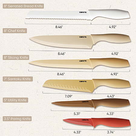 - Comprehensive Set: Includes 8" serrated bread knife, 8" chef knife, 8" slicing knife, 7" santoku knife, 5" utility knife and 3.5" paring knife.