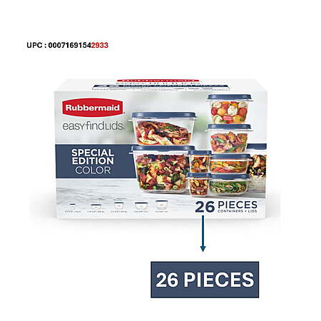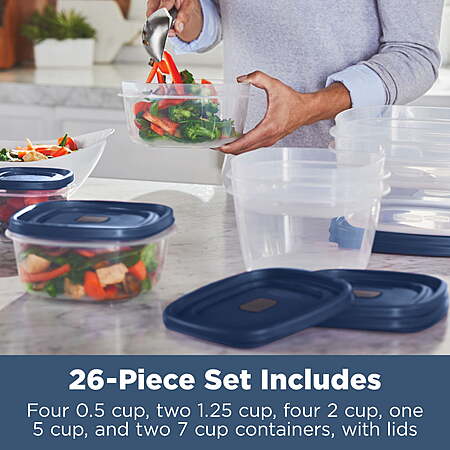 | Product Description: | Easily store food while minimizing clutter around your kitchen using Rubbermaid Easy Find Lids food storage containers. This 26-piece set, in a new Special Edition blue color, are designed for easy storage and help to keep cabinets and fridge organized. The variety of sizes in the set are perfect for everyday use, storing and reheating leftovers, and more. Set includes: Four 0.5 cup, two 1.25 cup, four 2 cup, one 5 cup, and two 7 cup, with lids. Featuring a new built-in vent for splatter-resistant microwaving, these meal prep containers are easy to organize and help conserve space in your cabinets. The lids snap to each other and to the bottom of the containers and have a vivid blue color, helping ensure that they are always easy to find. Plus one lid fits multiple bases for added convenience. Constructed from durable, BPA free plastic, these food containers are built to withstand a wide range of temperatures and are dishwasher, microwave, and freezer safe. Rubbermaid Easy Find Lids Food Storage Containers with Vented Lids, 26 Piece Set, Blue Special Edition Color: New for Black Friday this vivid blue color is perfectly on trend and adds style to cabinets and fridge. Easy Find Lids System: Space-saving lids snap to containers and each other, so they’re easy to keep organized. For added convenience, one lid fits multiple bases. Built-in Vents: Reduce unwanted splatters, messy microwaves, and time-consuming cleanup. Stackable and Modular to Maximize Space: Containers stack perfectly to one another to save space, and stay organized, in the pantry or fridge. BPA-free and Easy Care: Containers are dishwasher-, microwave-, and freezer-safe. 26-Piece Set Includes: Four 0.5 cup, two 1.25 cup, four 2 cup, one 5 cup, and two 7 cup, with lids. |