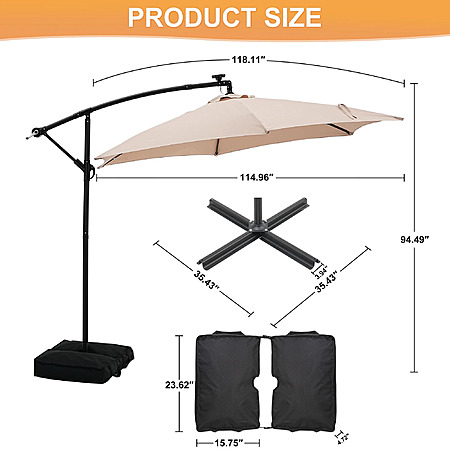 - Specifications: Offset Cantilever Solar Umbrella with a 10 ft size, 94.5-inch height, and a base size of 35.43*35.43 inches. Gross weight is 28 lbs, and net weight is 24 lbs.