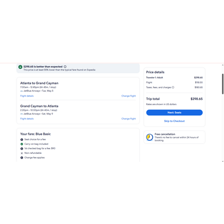 JetBlue and Expedia have round trip airfares travelling from Atlanta (ATL) to Grand Cayman Islands (GCM) for $299, making 1 stop both ways. These are basic economy fares that allow a personal item and a carry-on bag. There is no seat selection and no change. If you are travelling with children, you will be seated together as per JetBlue's policy.