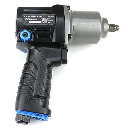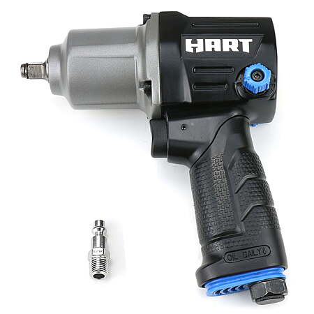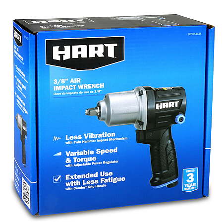 This HART 3/8 in. Air Impact Wrench is a new item. It features twin hammer impact mechanism for definite torque of 250 ft-lbs but with less vibration. The ergonomic design with durable aluminum housing helps reduce user fatigue. The cushioned handle grip increases tool control during performance. This durable pneumatic tool is ideal for tightening and/or loosening threaded fasteners, bolts and nuts. It is great for automotive and garage use as well as for other workshop applications. New HART 3/8 in. Air Impact Wrench. Extended Use with less fatigue with comfort grip handle Twin-hammer impact mechanism creates 250 ft-lbs of torque Adjustable 3-position power regulator in forward and in reverse provides variable speed and torque Air exhausts from the handle base of tool A reliable tool for mechanics and many other DIYers Specifications Square Drive: 3/8" No Load Speed: 9,000 RPM Max. Torque: 250 ft-lbs Avg. Air Consumption: 4 CFM @ 90 PSI Operating Pressure: 90 PSI Air Inlet: 1/4" NPT Recommended Hose Size (ID): 3/8" Includes: (1) 3/8 in. Air Impact Wrench, (1) 1/4" NPT Male Plug, and (1) Operator's Manual