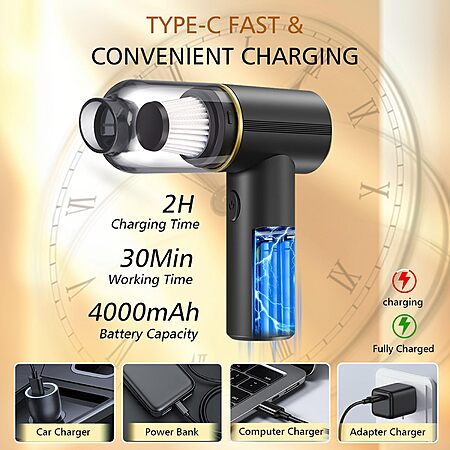 - Long Lasting Cordless Use - Long Lasting Battery - The portable hand vacuum takes 2.5 hours to fully charge,and the continuous using time is up to 30 minutes.The hand vac can completely clean your entire room on a full charge.
