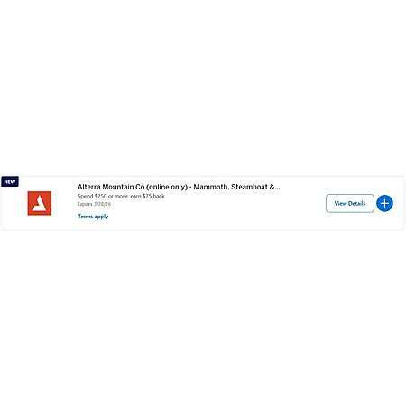 Earn a one-time $75 statement credit after using your enrolled eligible Card to spend a minimum of $250 in one or more qualifying purchases online at alterramtn.co [alterramtn.co] by 3/28/2026. Excludes IKON Pass. See terms.