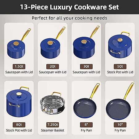 Model: Nuwave Lux LE 13-Pc Cookware Set with Elegant Gold Handle, Diamond Infused Ceramic Non-Stick, PFAS Free, Premium Metal Lids, Ergonomic Stay-Cool Handles, Induction Ready & Compatible w/All Cooktops