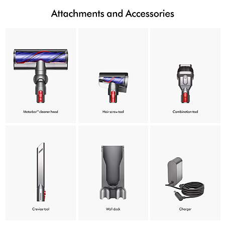 | Product Description: | Some cordless vacuums sacrifice suction for lightness. The Dyson V9 Motorbar™ cordless vacuum delivers the powerful performance you’d expect from a Dyson, yet it’s 33% lighter than the Dyson V15™ vacuum. With up to 40 minutes of fade-free suction, it is pioneering Dyson technology concentrated for deep cleaning.¹ It has advanced, whole-machine filtration that captures pet allergens and fine dust and expels cleaner air.² The Motorbar™ cleaner head de-tangles wrapped hair as you vacuum. The innovative Hair screw tool with a conical brush bar is perfect for cleaning upholstery and pet beds. Thanks to the cordless format, it also transforms into a handheld vacuum with one click so you can clean up high, down low, and everywhere in between. Comes with a 2-year warranty and lifetime Dyson support. ¹In Eco mode. Actual run time may vary based on power mode, floor type and/or attachments used. ²In Boost mode. All other modes achieve at least 99.97% filtration. In the box: Motorbarᵀᴹ cleaner head, Combination tool, Crevice tool, Hair screw tool, Wall dock, Charger. The ideal balance of power and weight. With up to 40 minutes of fade-free Dyson suction.¹ Motorbarᵀᴹ cleaner head deep cleans all floor types and de-tangles hair as you clean. Hair screw tool sucks up long hair and pet hair. Fast. Its anti-tangle conical brush bar removes long hair and pet hair from pet beds, car seats, stairs, and more. LCD screen shows power modes, remaining run time, and maintenance alerts. Converts to a handheld vacuum for cleaning cars, stairs, and upholstery. Comes with 4 Dyson-engineered accessories to clean up high, down low, and everywhere in between. Advanced whole-machine filtration traps 99.99% of particles as small as 0.3 microns.² Expels cleaner air. Made from strong materials selected for their durability and lightweight properties. |
