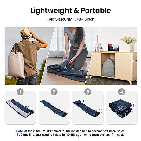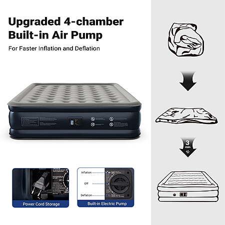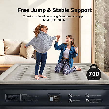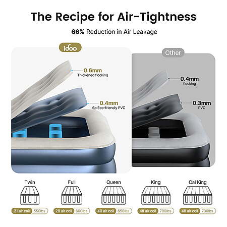| Product Description: | iDOO Luxury Air Mattress with Built-in Pump - King Size This air bed king size is equipped with the upgraded dual chamber design providing faster and easier inflation and deflation. In 3 minutes inflated with just the turn of the button and remain for days. No worries about repeated inflation. The thick, multi-layer PVC material of the inflatable mattress features puncture-resistant and waterproof, ensuring a durable and long-lasting mattress. The 48 internal air coils provide exceptional support and keep the blow up mattress firm and flat. With a capacity of 700 lbs, this king air mattress can accommodate 3 or 4 people comfortably. The folded air bed is easy to store and, you can take it everywhere with a storage bag. Perfect for family outings, camping trips, guest beds, and more! What's in the Box 1 x Air Mattress 1 x Storage Bag 1 x User Manual 2 x Repair Patch Inflation and Deflation in Just 3 Minutes: Thanks to its upgraded 4-chamber structure, the iDOO King air mattress with a built-in electric air pump is incredibly easy and quick to use. It eliminates the need for an additional manual valve, significantly reducing the time required for inflation and deflation. Ultra-High Load-Bearing Capacity: The exclusive and innovative strapping technology, combined with 48 enhanced air coils, makes the entire mattress extremely supportive and comfortable. The iDOO 18" air mattress king size can support a maximum weight of 700 lbs, providing ultimate comfort and support for your spine and body throughout the night. Enhanced 48 Air Coil Structure: This structure not only enhances the durability and support of the iDOO air mattress King but also prevents it from tilting or flipping when you sit on its edge or corner. Material Upgrade: iDOO inflatable mattress is crafted from a 0.4mm 6P eco-friendly PVC material with a K80 resin formula and a 0.6mm thickened flocking layer. This combination results in a 66% reduction in air leakage. The material is highly waterproof, tough, wear-resistant, easy to clean, and resistant to deformation. A non-slip strip on the bottom enhances stability, reduces noise, and prevents tipping or slipping. Additionally, all iDOO inflatable mattresses come with a repair kit for easy repairs in case of accidental punctures or tears. Space-Efficient Design: When inflated, the King air bed measures 75×54×18 inches. When deflated, it conveniently folds down to just 16×7×13 inches and comes with a storage pouch for tidy storage in a cabinet, keeping it out of sight until needed. It's quick to set up for overnight guests and ready to use at a moment's notice. Warm Tips: PVC materials tend to expand and stretch naturally after the first few inflations, which might give the appearance of leakage. This is normal. Simply inflate the mattress regularly to maintain its firmness. Warm Tips: PVC materials tend to expand and stretch naturally after the first few inflations, which might give the appearance of leakage. This is normal. Simply inflate the mattress regularly to maintain its firmness. Quality Commitment: iDOO is dedicated to using high-quality materials and meticulous design to create durable inflatable mattresses. If you encounter any issues during use, our professional customer service team is ready to provide customized solutions. Experience the ultimate comfort and quality of iDOO air mattresses now! |