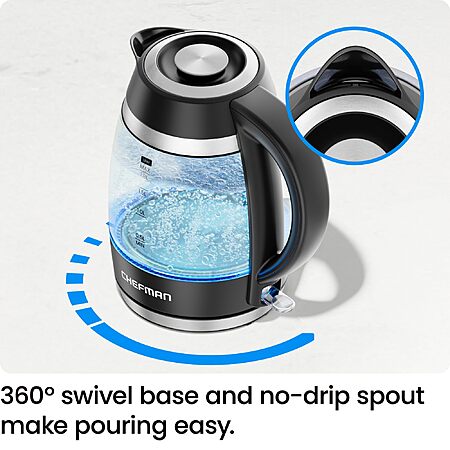 Chefman Electric Kettle, 1.8L 1500W, Hot Water Boiler, Removable Lid for Easy Cleaning, Auto Shut Off, Boil-Dry Protection, Stainless Steel Filter, BPA Free, Borosilicate Glass Electric Tea Kettle