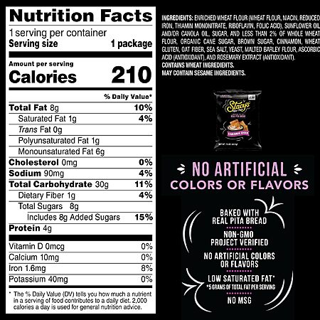 • Enjoy these portion friendly Stacy's Cinnamon Sugar Pita Chips on the go, as a delightful lunch companion, or anytime