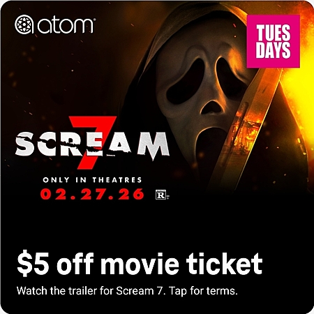 Atom tickets $5 off movie ticket. Scream 7 in theaters 2/27/26