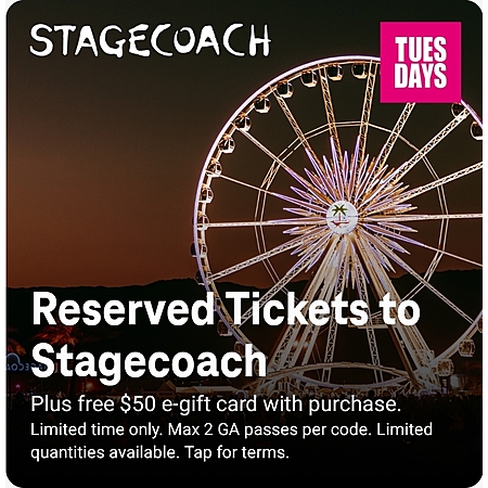 Stagecoach Festival: Reserved tickets to Stagecoach. Plus free $50 e-gift card with purchase. Limited time only. Limited quantities available. Max 2 GA passes per code.