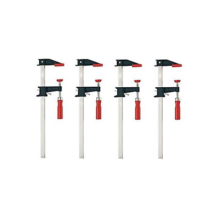 This economical clutch-style bar clamp has cast heads, coated steel bars, wooden handles and swivel pads, but not the higher price. Affordable enough to fully equip your shop and to solve all your clamping needs.Clamping capacity is 12 inches, throat depth is 2-1/2 inches, and bar size is 1/4 X 3/4 inches. Sold as pack of 4 clamps.
