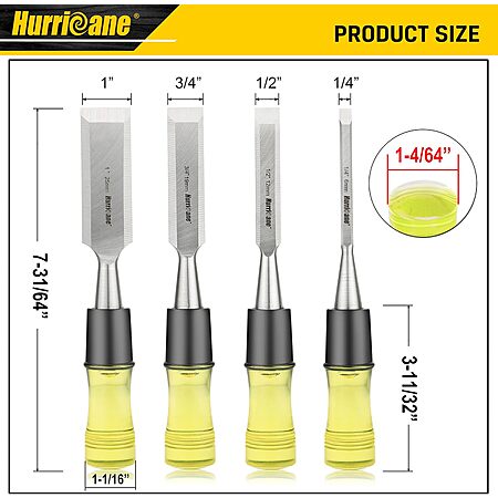 • Safety & Portability: This four sizes (1/4"; 1/2"; 3/4"; and 1") chisel set with blade guards protects edges during storage