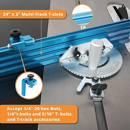 - Multi-track miter fence: smooth, built-in laser engraved measuring scale, extruded aluminum profile with a universal design that accepts accept 1/4"-20 hex Bots, 1/4" t-bolts and 5/16" T- bolts, and T-track accessories