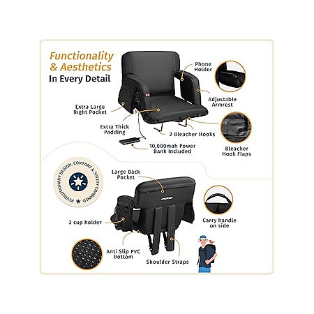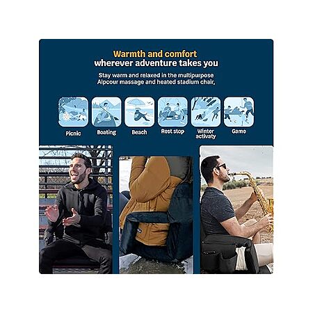 - Max Comfort Experience – Padded stadium seat with foldable armrests, 3 heat levels, and 3 massage settings for ultimate relaxation.