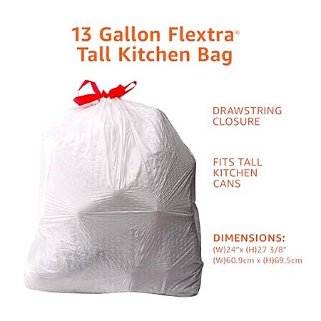 Model: 120-Count 13-Gallon Amazon Basics Flextra Tall Kitchen Drawstring Trash Bags (Fresh Scent)