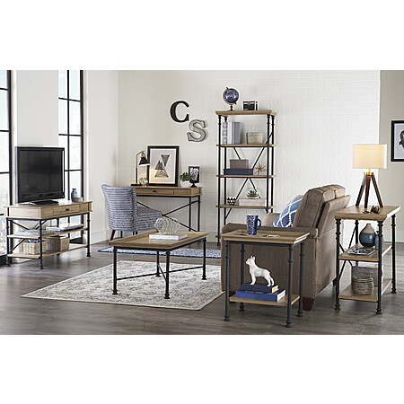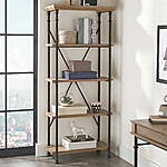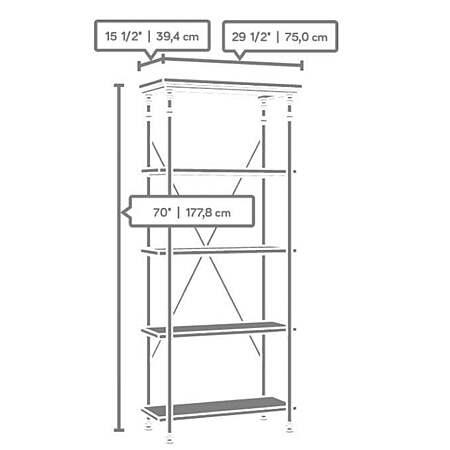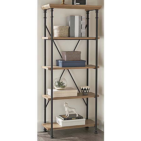 Stack, store, and display your books, framed photos, and journals on this modern and industrial style Better Homes & Gardens River Crest 5 Shelf Bookcase. It features five spacious, 1" thick shelves that hold and books, binders, framed photos, collectibles, and whatever your little heart desires! The powder-coated metal frame and rear crossbars for stability add an extra touch of an industrial yet rustic style that will stand out in any room. Its metal frame provides added durability that is sure to hold up for years to come. The mixed material aesthetic and simple design of this unit gives it a contemporary, yet natural feel that will transform your room. This River Crest bookcase is a versatile fit for the living room, office, bedroom, or virtually anywhere and it's sure to get your home looking organized in no time! This bookcase is 70". Assembled Dimensions: 15.51" L x 29.53" W x 70.00" H Mixed material aesthetic 1" thick shelves Finished on all sides for versatile placement Rear crossbars for stability Rustic Oak finish Model #: 418305 For additional questions, please contact the manufacturer at 1-800-523-3987 Be sure to check out the Better Homes & Gardens River Crest collection for more great items!