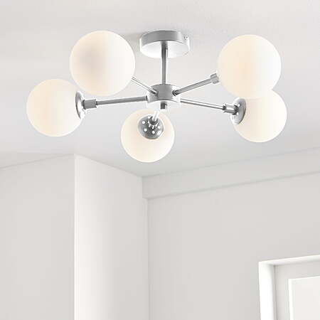 The Better Homes & Gardens fixture is well-design for your home decoration. With five arms sticking out of the center, branching arms feature five frosted globe glass shades at the ends. This metal light fixture features a satin nickle finish. This Better Homes & Gardens frosted globe glass ceiling light is a great decoration to your house. This light will be suitable in dinning room, bar, kitchen and more. This fixture is equipped with five dimmable 40W equivalence T6 opal filament bulbs. This decorative bulb is rated to last 13 years based on 3 hours per day use. This light bulb uses only 5 Watt of energy to produce light, which is equal to light from a 40W incandescent. Our fixture is ETL listed for your safety. Better Homes & Gardens Five Globe Flush Mount Ceiling Light Satin Nickle Finish Classic design with one 5W Equivalent T6 filament bulb 5 years limited life time warranty for defects in material and workmanship Size: 25.98x25.98x8.27IN Dimmable 1 T6 5W filament bulb Light output: 450 Lumen x 1 Color temperature: Soft white 2700K Estimated energy cost is $0.6 per year 15000H life time