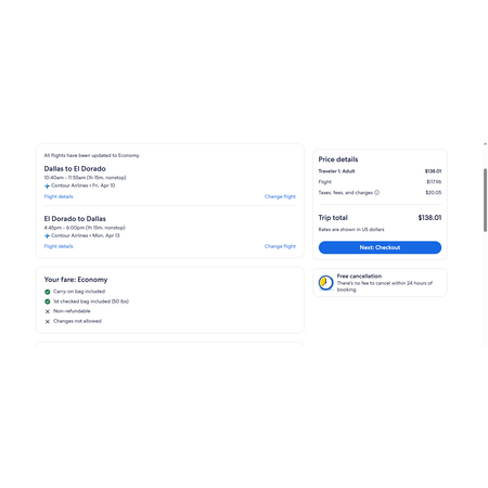 Contour Airlines, a regional premium low-fare air carrier (offering free checked bag and complimentary refreshment service) have airfares travelling to and from Dallas (DFW) and Eldorado (South) Arkansas (ELD) for $69 one-way or $138 round trip, nonstop. These introductory airfares are economy fares that include a carry-on bag and a free checked bag. Travelers can also book connections with Contour's interline partners; Alaska, American, JetBlue, and United Airlines.