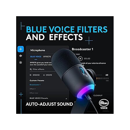 Use LIGHTSYNC to control two separate RGB light zones on the mic and sync them with other G gear in G HUB, such as a pc microphone and keyboards, for a fully immersive experience. Add fun vocal effects with Blue VO!CE software, and use Smart Audio Lock or set the gain manually with easy on-mic controls.