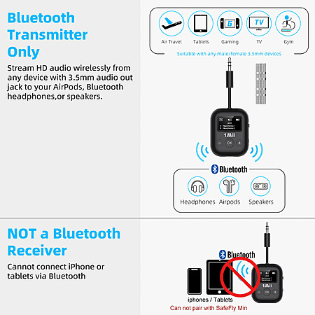 - Note: Bluetooth Transmitter ONLY. Not suitable for hearing aids and musical instruments such as guitars.