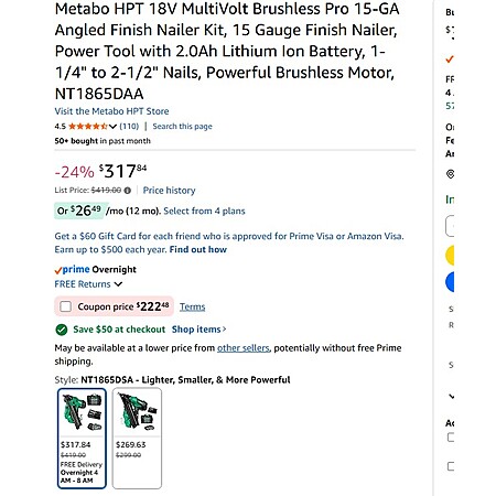 $168.85 Metabo HPT 18V MultiVolt Brushless Pro 15-GA Angled Finish Nailer Kit, 15 Gauge