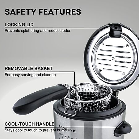 - SAFETY FEATURES YOU'LL APPRECIATE – Locking lid minimizes splatter and odor, while cool-touch handles protect hands and enhance handling safety. The deep fryer's cord is designed for easy removal, allowing quick disconnection in emergency situations.
