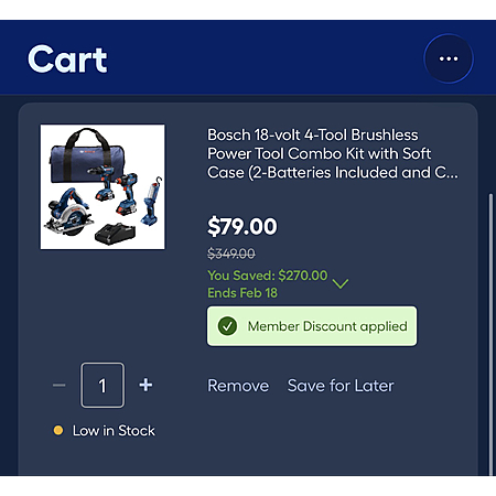 Discount ends today, February 18th, Lowe's had this nice 4 kit tool from Bosch including battery and charger for $179, once you add to the cart there's an extra $100 off bringing the total down to $79.
