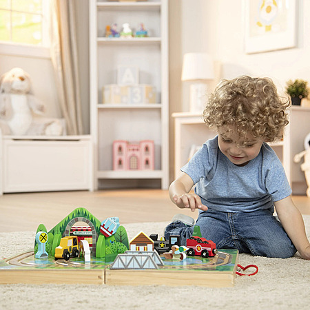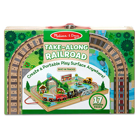 About this item- Melissa & Doug 17-Piece Wooden Take-Along Tabletop Railroad and Trains, for Kids and Toddlers 3+