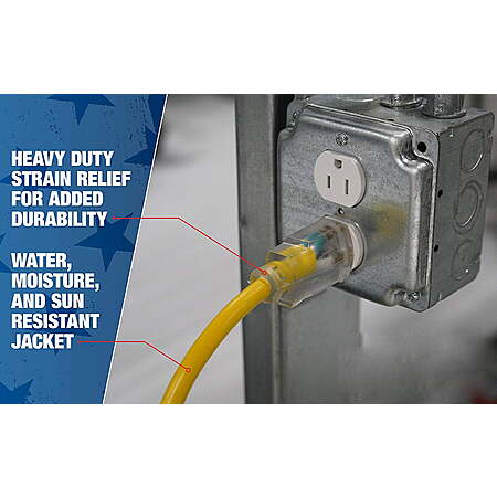 The Southwire 100-Foot Heavy Duty Extension Cord gives you the power of an outlet wherever you need it. With an SJTW jacket, it comes weather resistant and suitable for outdoor use. It can also handle a current of up to 15 amps, meaning it can handle heavy duty power tools like table saws and drills. The cord is easily visible thanks to its bright orange color, so it's easy to spot in the middle of tall grass or behind bushes. Additionally, the ends of the cord light up when it has a current flowing through it, so you always know if you're dealing with a live cable or not. Meeting OSHA standards for use in a professional enviornment, the Southwire 100-Foot Heavy Duty Extension Cord can meet the demands of even the most dedicated professional.