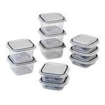 | Product Description: | This 20-piece set of square food storage containers is great way to stock up on pieces you need. It includes five 5.2 cup containers and five 2.9 cup containers, plus their sturdy, snug-fitting lids. These are great for meal-prep, for leftovers and snacks, and for taking lunch to work. The unique Click and Close lids let you hear that the lid is securely closed and leakproof, so there's no worry about spilling from a lid that's accidentally ajar. Not just for refrigerator storage, they're also perfect for pantry and freezer use, as well. The domed lids mean you can use the full capacity of the container without having the lid compress or smash the food as it's pressed onto the container, and no worries about liquids squirting out the sides of an overfilled container. When empty, the containers nest compactly for easy storage, and when full they stack perfectly so they won't topple in the fridge. These handy containers are freezer safe, microwave safe with the lid removed, and dishwasher safe for simple cleaning. These are durable, long-lasting, and made without BPA, and are recyclable when they're no longer needed. GoodCook 20-Piece Square Container Set, Made Without BPA: Five 2.9 cup square and five 5.2 cup square containers with lids Durable construction with Click and Fresh lid ensures a secure seal for leftover food storage Domed lid prevents compression of food Integrated measurements provide precise tracking of food quantity stored Made without BPA for long-lasting, safe use Dishwasher-safe for easy cleanup |