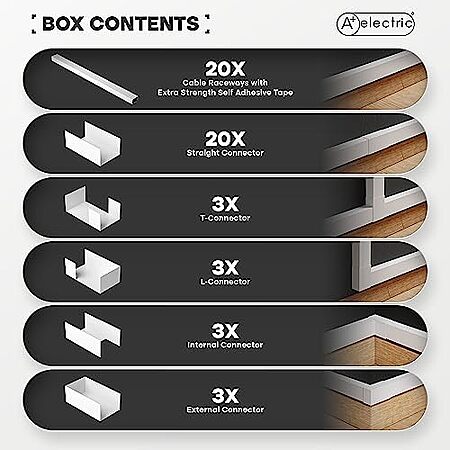 A Plus Solutions, LLC via Amazon[amazon.com] has 20-Piece 315" A+ ELECTRIC Cable Raceways Management Kit (White) for $23.99. Shipping is free with Prime or on $35+ orders.