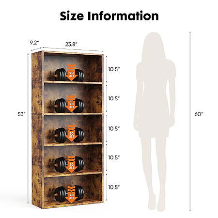 - ]- Never worry about storage space again with our 5 tier bookcase measuring 9.2"D x 23.8"L x 53"H. Each 10.5" high layer is perfect for organizing your belongings.
