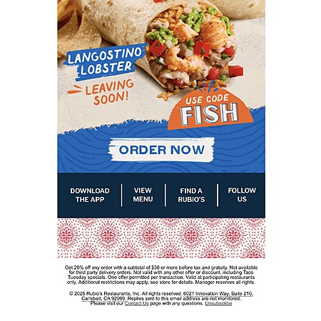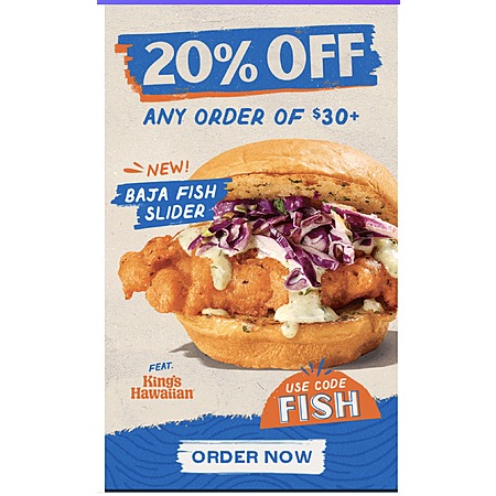 Get 20% off any order with a subtotal of $30 or more before tax and gratuity. Not available for third party delivery orders. Not valid with any other offer or discount, including Taco Tuesday specials. One offer permitted per transaction. Valid at participating restaurants only. Additional restrictions may apply, see store for details. Manager reserves all rights.