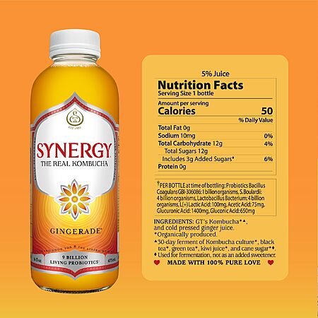 SYNERGY The Real Kombucha - Gingerade - 16 fl oz Bottle - Raw Probiotic Drink for Gut Health and Immune Support $2.7