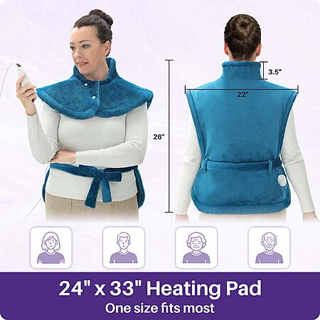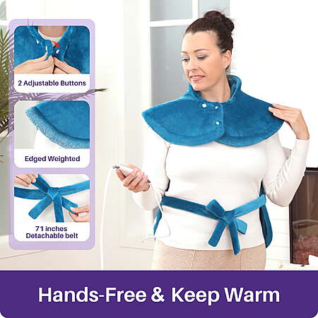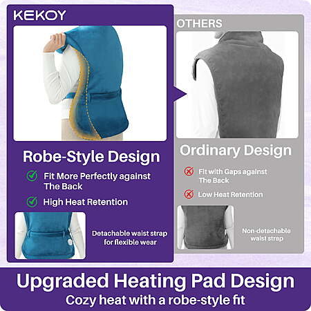 | Product Description: | KEKOY 24" x 33" Heating Pad is a wearable electric heating pad designed for back, neck, and shoulders pain relief. The robe-style design with a detachable 71" waist strap allows hands-free use while delivering fast, even heat across the body. With 4 adjustable heat settings (110℉–140℉), 2-hour auto shut-off, and built-in overheat protection, this large heating pad provides safe, comfortable full-body pain relief for daily relaxation at home. Soft flannel fabric, weighted edges, and machine-washable design make it easy to use, easy to clean, and ideal for everyday comfort. Specifications: Size: 24" x 33" Belt length: 71 inches Color: Blue Power Supply: Wall Adapter Material: 180gsm + 180gsm Flannel Heat Level: 4 Levels (110℉–140℉) Auto-off Timing: 2H Wearable Robe-Style Design with Detachable Waist Strap: Robe-style wearable design wraps comfortably around the back, neck, and shoulders for hands-free use. Features a 71" detachable waist strap for flexible adjustment or easy removal—more comfortable than fixed-strap heating pads. Full-Body Pain Relief from Neck to Feet: This 24" x 33" large heating pad provides soothing heat therapy for the neck, shoulders, back, waist, abdomen, legs, and feet. Deep-penetrating warmth helps relax tense muscles, ease daily aches, and promote blood circulation—ideal for back pain relief, muscle stiffness, post-workout recovery, or cold days. FC & UL Certified for Reliable Safety: This KEKOY electric heating pad is FC and UL certified, designed to meet safety standards while delivering consistent, reliable heat therapy at home. 2-Hour Auto Shut-Off for Safe Use: Built-in 2-hour automatic shut-off and overheating protection help prevent prolonged heating, allowing you to relax with peace of mind during everyday use. Fast Heating with One-Button Control: Heats up quickly with an easy-to-use controller. Choose from 4 heat levels (110℉, 120℉, 130℉, 140℉) to personalize warmth—simple operation suitable for adults and seniors. Soft, Skin-Friendly & Stays in Place: Made with soft flannel fabric that is delicate, smooth, breathable, and gentle on skin. Weighted edges and adjustable collar buttons help keep the pad securely in place for even heat distribution. Easy to Clean & Machine Washable: Keeping your heating pad fresh is simple. Remove the controller before cleaning, then machine wash on a gentle cycle. Durable materials maintain softness and performance wash after wash, making daily comfort easy to maintain. A Heartwarming Gift for Loved Ones: With its wearable design, comforting warmth, and easy operation, the KEKOY heating pad makes a thoughtful gift for family members, partners, and seniors—perfect for everyday relaxation and care, not just special occasions. |