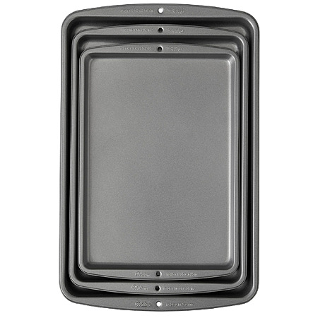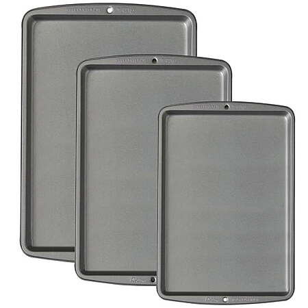 | Product Description: | Premium Non-stick Bakeware Baking Sheet set. Designed specifically for bakers and cooks, this carbon steel 3-piece sheet set provides superior quality. Engineered for everyday performance & designed for durability, this sheet set resists warping and promotes even heat distribution while baking, making it the baking pan that will last for years. The premium non-stick coating ensures effortless release of baked goods & foods, so they release without effort and clean-up is easy. No more scrubbing and sticking - just enjoy perfectly baked mini cheesecake bites, stuffed potatoes or veggies and more with minimal effort. Scratch resistant & oven safe up to 450 degrees Fahrenheit. Great for holiday celebrations, anniversaries, family dinners or birthdays. Some foods may stain the metal but will not affect the performance. Dishwasher safe. Includes a 10-Year Limited Warranty. For terms & conditions, please visit Wilton.com. At Wilton, we are champions of adding sparkle and fun to any occasion. From an extensive array of baking and decorating products to skill-building classes, it's our treat to help you create sweeter moments. Same Great Pan, New Name: Previously known as Bake It Better, this bakeware is now part of our Premium line—offering the same trusted quality and performance you know and love. Non-stick coating ensures effortless release of baked goods & foods, so mini mac and cheese bites or mini cupcakes slide right out, and clean-up is easy Durable, carbon steel provides superior quality, distributes heat evenly & resists warping Designed for durability, safe for use with metal tools, & scratch-resistant (abrasive cleaners & scouring pads, not recommended) Oven safe up to 450 degrees Fahrenheit Dishwasher safe, but to protect the finish, dishwashing tablets are not recommended Use & Care for best results with Wilton Premium Bakeware: wash in warm, soapy water before first and after each use. To protect the finish, do not use dishwasher detergent tablets. Avoid cleaning with abrasive cleansers or scouring pads; we recommend using only those products that are labeled “safe for non-stick surfaces.” Some foods may stain the metal but will not affect the performance. |