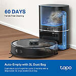 - Automatically empties its dustbin into a sealed 3L dust bag after each cleaning session, holding debris for up to 60 days based on usage. Say goodbye to daily maintenance and enjoy truly hands-free cleaning.