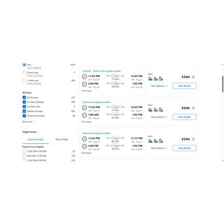 Fiji Airways via Booking.com have round trip airfares travelling from Los Angeles (LAX) to Auckland New Zealand (AKL) for $594, making 1 stop in Fij. Choose from several hours stopover in Fiji or up to 28 hours as there are many flight options. These are value economy fares that allow a personal item, a carry-on bag and 1 free checked bag. You're allowed to change this flight for a fee.