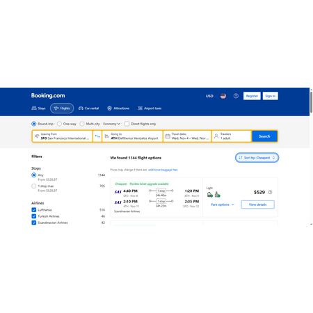 SAS (Scandinavian Airlines) via Booking.com have round trip airfares travelling from San Francisco (SFO) to Athens Greece (ATH) for $529, making 1 stop in Copenhagen Denmark both ways for up to 22 hours so plan ahead and see the city. These are SAS Go Light Fares that will only allow a personal item that fits under the seat in front of you and a carry-on bag.