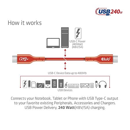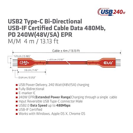 - USB Power Delivery, 240 Watt(48V/5A) charging, Fully bi-directional, USB IF certified