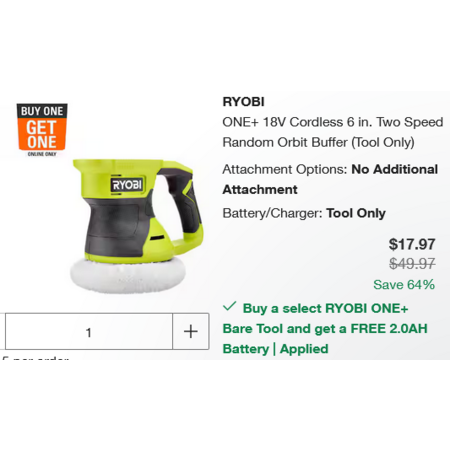 3. Either return or don't pickup the RYOBI ONE+ 18V 2.0 Ah Lithium-Ion HIGH PERFORMANCE Battery and you end up with the RYOBI ONE+ 18V Cordless 6 in. Two Speed Random Orbit Buffer (Tool Only) for $17.97.