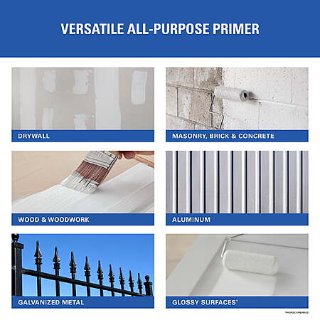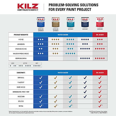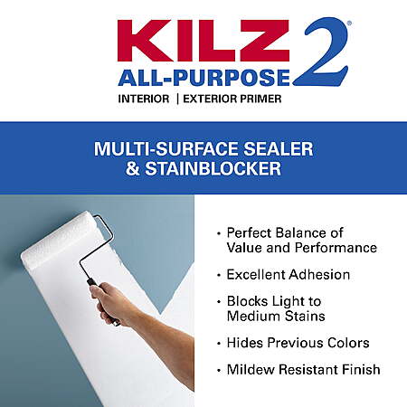 | Product Description: | KILZ 2 All-Purpose Primer is a fast drying, water-based, multi-surface primer-sealer-stainblocker with excellent adhesion, mildew resistance, sealing properties and very mild odor. KILZ 2 All-Purpose Primer blocks medium stains including minor water stains, rust, grease, ink, pencil and felt marker. Enhanced hiding makes it ideal for changing colors and helps lessen the number of coats of paint required. Use on interior and exterior surfaces including woodwork, drywall, plaster, paneling, masonry, brick, painted metal and properly prepared glossy surfaces. Use under or over water-based or oil-based paints. Versatile interior and exterior all purpose primer blocks light to medium stains including minor water stains, rust, grease, ink, pencil and felt marker Fast drying primer, sealer and stain blocker lessens the number of top coats required, and can be top coated in 1 hour Ideal for changing paint colors, KILZ 2 helps achieve a truer top coat color Use under or over water-based or oil-based paints Use on interior and exterior surfaces including woodwork, drywall, plaster, paneling, masonry, brick, painted metal and properly prepared glossy surfaces (not recommended on flooring |