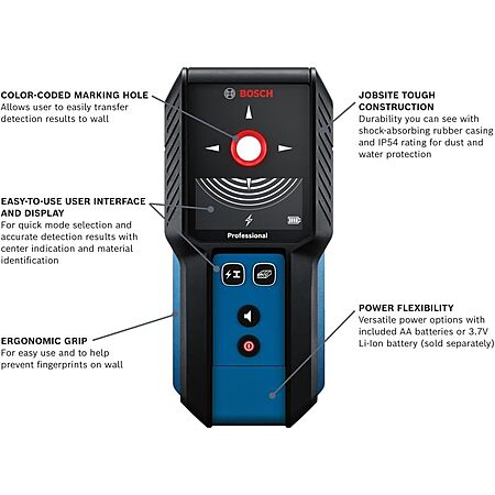 - DUAL POWER FOR ZERO DOWNTIME: Never let a dead battery stop your workflow. This scanner offers true power flexibility, running on the included AA batteries for immediate use or on a Bosch 3.7V Li-Ion battery (sold separately) for extended, rechargeable performance, a must-have for any pro.
