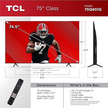 Model: TCL Q Class TV 75-Inch QLED 4K HDR Smart with Google TV