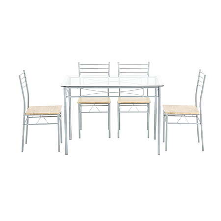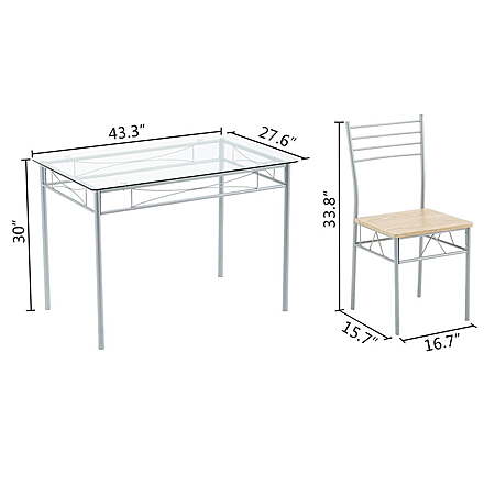 - 3. Elegant design: Glass table top with shelf below the top . Four MDF chair top material connect with sliver iron pipe. It makes your room looks like more modern and fashion