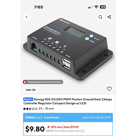 Ali Express has Renogy 10A charge controller on sale for $9.80.